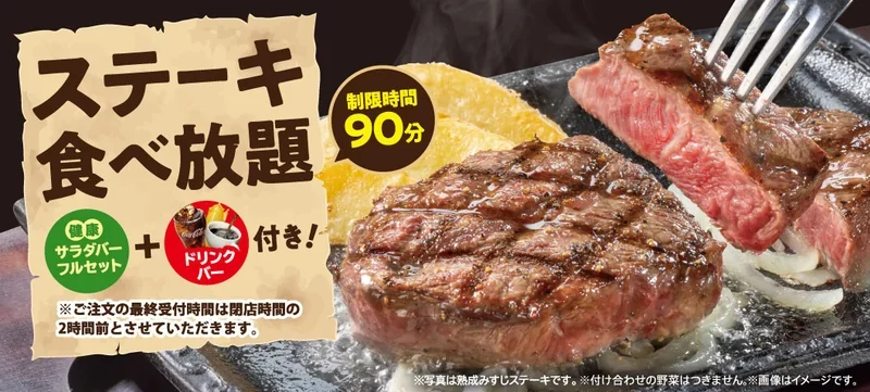 ステーキガストでは毎月一度、29(ニク)日前後の金曜日に全国約80店舗で食べ放題イベントを実施している。サラダバー・ドリンクバーが“フルセット”で付帯するため、通常メニューを個別に注文するよりもトータルで1,000円以上お得になる計算だ。注文はテーブル全員同一コースが条件で、最終受付は閉店2時間前。制限時間は料理提供から90分となる。
