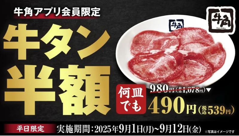 | 牛タン塩 半額 | 2025年9月1日から12日の平日 | 980円(税込1,078円) | 490円(税込539円) | 制限なし |