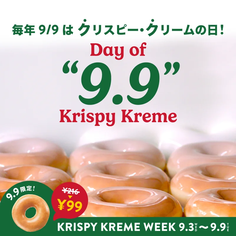 | 9月9日特別価格販売 | 全顧客 | 9/9のみ | オリジナル・グレーズド | 99円(イートイン101円) | 1組3個まで、各店上限到達で通常価格、予約不可 | 通常店舗のみ |