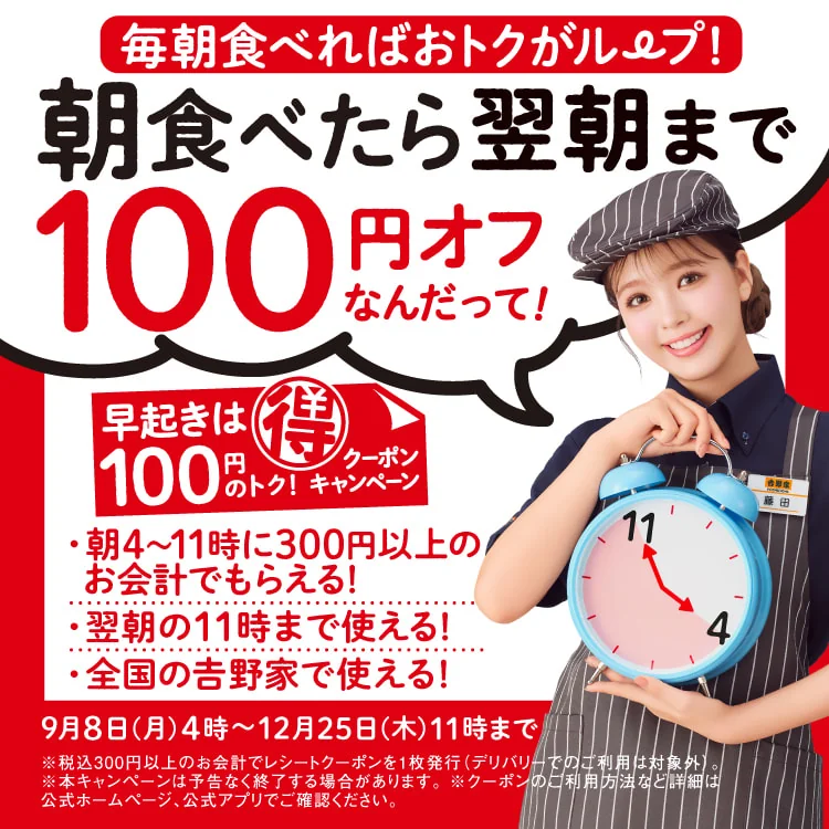 2025年9月〜12月 吉野家「朝活100円オフ」徹底解説——翌朝11時まで有効のレシートクーポンの使い方と注意点