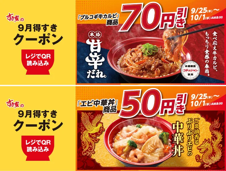 すき家がアプリ限定で配信する「9月得すきクーポン」第3弾は、2025年9月25日9時開始、10月1日8時終了という朝またぎの短期施策である。割引の柱は二つで、プルコギ牛カルビ焼肉丼系とエビ中華丼系の価格を直接引き下げる。アプリ決済時は自動適用、店頭決済時はクーポン提示という運用が明確で、併用条件にも差がある。無駄なく使うには期間、対象、併用可否の三点をまず押さえるべきだ。