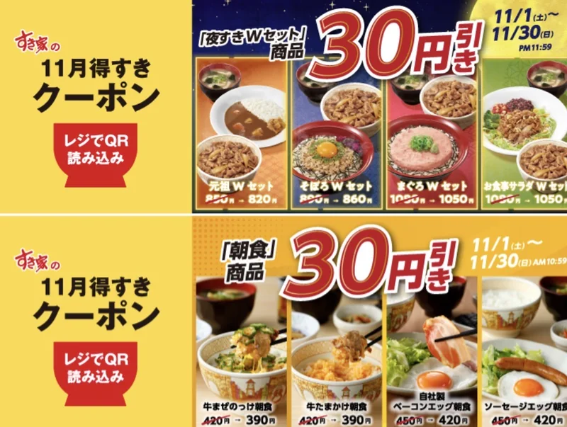 本施策はすき家公式アプリ限定のクーポン配布であり、名称は「11月得すきクーポン」である。夜すきWセットはPM5:00〜AM5:00に販売される4種のセットが対象で各30円引き、朝食はAM5:00〜AM11:00に提供される全メイン商品が30円引きとなる。期間は11月1日AM5:00またはPM5:00の開始から、11月30日AM10:59またはPM11:59の終了まで設定されている。