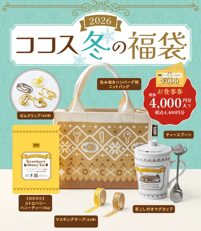 中身はニットバッグ、茶こし付きマグカップ、ティースプーン、ストロベリーハニーティー30グラム、マスキングテープ2種、ゼムクリップ5種、そしてお食事券の計7点構成だ。雑貨群は冬の外出やティータイムで実用度が高く、色味やデザインはココスらしさを押し出した落ち着いた仕上がりである。日常使いの頻度を考えると費用対効果は高い。