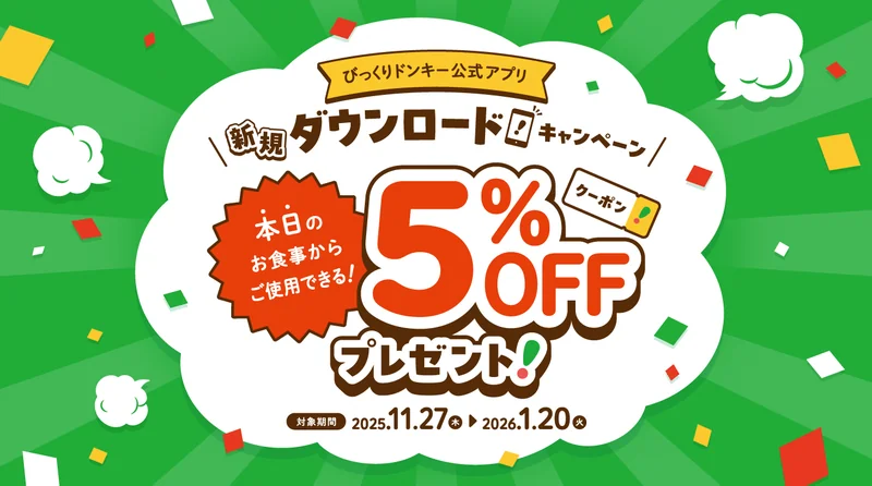 びっくりドンキーは、公式モバイルアプリの新規ダウンロード者を対象にした割引施策を展開している。対象期間は2025年11月27日から2026年1月20日までであり、この期間中にアプリを新規インストールした利用者に対して、お食事5%OFFクーポンが配信される。クーポンはダウンロード当日から利用可能であり、会計時に提示することで飲食代金の一部が割引される仕組みである。キャンペーンは全国のびっくりドンキー全店に適用される点が特徴であり、クーポンの適用範囲や対象サービスはアプリ内クーポン画面に記載された利用条件を確認する必要がある。