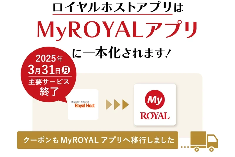 ロイヤルホストは長年提供してきた公式アプリのサービスを2025年3月31日をもって終了しました。終了に伴い、アプリで配信されていたクーポンやテイクアウト商品のモバイルオーダー機能も停止され、利用者は新アプリ「MyROYAL」への移行を求められています。旧アプリに登録した情報は新アプリへ引き継げないため、ユーザーは改めてMyROYALで新規登録を行う必要があります。