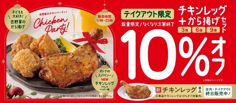 吉野家の「チキンレッグ+から揚げセット10%オフ」は、2025年12月19日11:00開始で在庫終了までのテイクアウト限定施策である。対象は3個・6個・9個のセットで、税込799円・1,158円・1,469円が特別価格として提示されている。単品チキンレッグは割引対象外で、デリバリー販売もない。実施店舗と販売時間を先に確認し、必要ならスマホ予約で受け取りを最適化するのが合理的だ。購入目的が割引であれば、会計前のセット表示確認が最重要になる。
