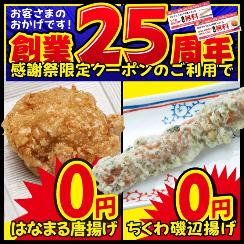 | 無料 | はなまる唐揚げ1個無料 ×1枚 | うどん1杯購入ごとに1枚 | 2026年2月25日 |