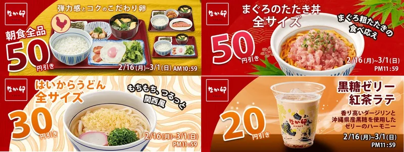 なか卯公式アプリ限定で「2月得とくクーポン」が配信されます。対象期間は2026年2月16日から3月1日までで、朝食は50円引き、まぐろ丼は50円引き、うどんは30円引き、黒糖ゼリー紅茶ラテは20円引き。クーポンは期間中何度でも使えますが、デリバリー対象外や朝食販売店舗のみなどの条件があります。対象店舗は全国のなか卯445店舗とされており、支払いをアプリ内決済にすると紙の優待券などと併用できない点も要注意です。