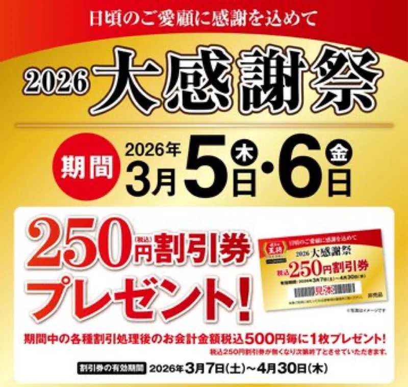 餃子の王将の「2026大感謝祭」は、2026年3月5日と3月6日の2日間限定。各種割引を反映した会計金額が税込500円ごとに、次回使える「税込250円割引券」が1枚もらえます。配布はなくなり次第終了なので、狙うなら早めが安全です。