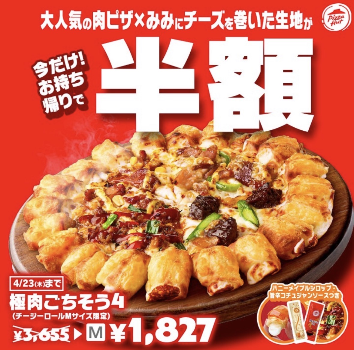 ピザハットのごちそう4半額として実際に狙うべきなのは、「極肉ごちそう4(チージーロール)」のお持ち帰り半額です。価格は通常3,655円が1,827円、期間は2026年4月23日までの13日間限定で、Mサイズ・チージーロール生地限定という条件付きです。条件を外すと同じ価格にはならないので、注文時は受取方法、サイズ、生地の3点を先に確認してください。肉系4種をまとめて試したいなら、かなりわかりやすいキャンペーンです。