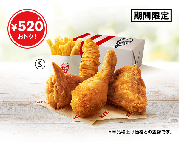 | セット内容 | オリジナルチキン3ピース / カーネルクリスピー1ピース / ポテト(S)1個 |