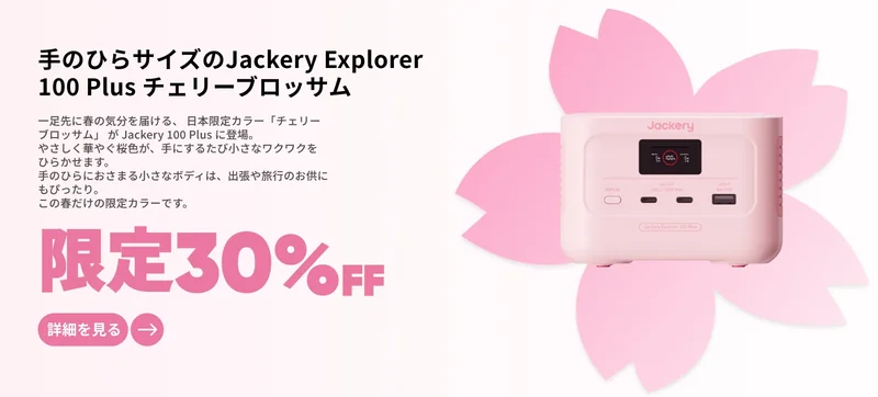 【2026年2月】Jackery Explorer 100 Plus チェリーブロッサム発売記念|30%OFF+メルマガ5%OFFの最終価格と買い方