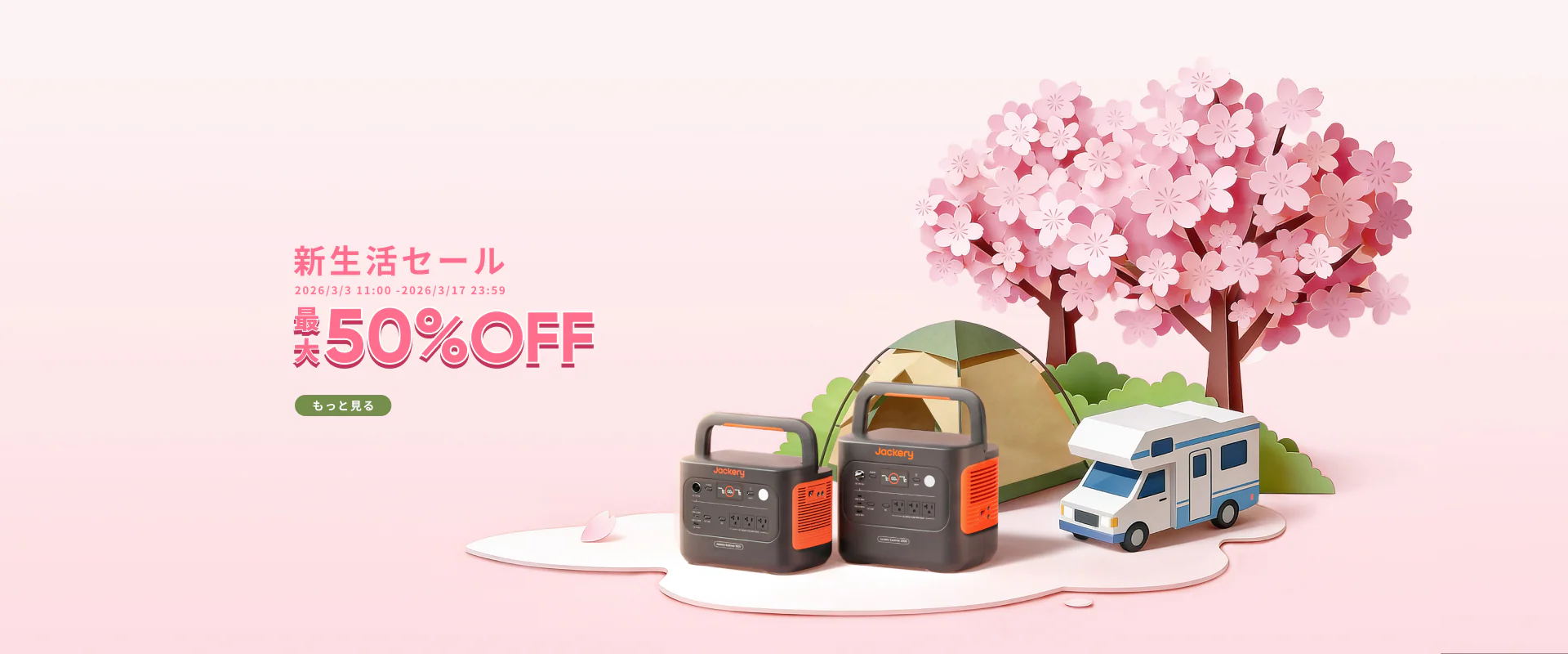 停電対策やアウトドアの電源として、ポータブル電源は「必要になってから探す」と高くつきます。Jackery公式の新生活セールは、期間が2026/3/3 11:00〜2026/3/17 23:59と短めで、会場表示では最大50%OFFが明示されています。さらに、家電大賞4年連続金賞記念キャンペーンとして、1500 New向けの5%OFFクーポンや、2000 Newでセール併用時55%OFFになる自動適用クーポンの情報も確認できます。この記事は、まず期間と値引き例を数字で固定し、次に追加クーポンの取りこぼしを防ぐための確認ポイントだけに絞って整理します。