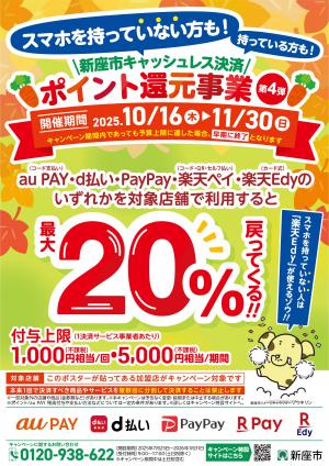 「新座市キャッシュレス決済ポイント還元事業(第4弾)」は、市内中小店舗でauPAY・d払い・PayPay・楽天ペイ・楽天Edyを利用すると決済額の20%がポイントで戻る施策。1決済あたり1,000ポイント、事業者ごとに期間中5,000ポイントまで還元される。予算に達し次第終了するため、早めの利用がカギ。