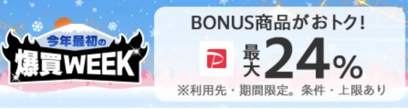 爆買WEEKは、2026年1月30日0:00〜2月1日23:59に対象ストアのBONUS商品を買い、合計5,000円以上で+4%、20,000円以上で+7%のPayPayポイント(期間限定)を狙う企画です。複数注文は合算できるので、まずエントリーしてBONUS対象を確認し、合計金額を設計するのが勝ち筋。上限3,000円相当と期限の短さが本質的な罠なので、付与予定ポイントまで見て使い切る前提で動きましょう。