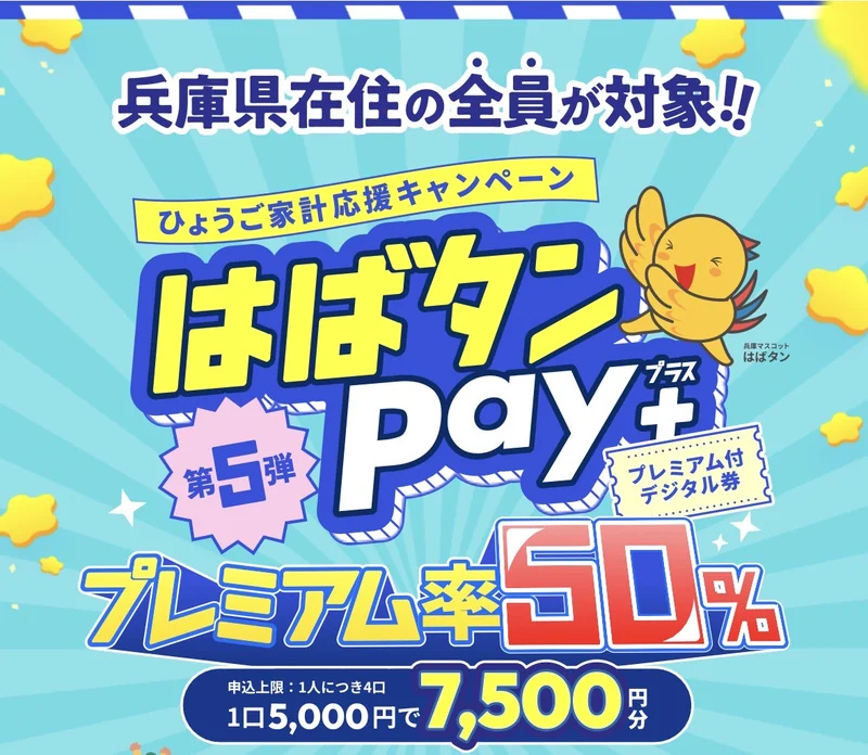 はばタンPay+第5弾は、兵庫県在住者向けのプレミアム付デジタル券です。発行総額は279億3,000万円(プレミアム分93億1,000万円含む)で、1口7,500円分を5,000円で販売。申込上限は1人4口で、予算を上回る場合は抽選で口数が調整される場合があります。利用には専用アプリを入れたスマートフォンが必要で、商店街の小売店、スーパー、コンビニ、ドラッグストア、飲食店など県内加盟店で使えます。