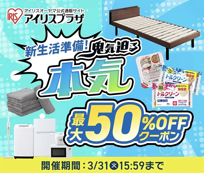 アイリスプラザで新生活向けの大型セールを探しているなら、まず確認したいのが「新生活応援!鬼気迫る本気セール」です。今回の訴求は最大50%OFFクーポンで、家電だけでなく、収納・家具インテリア、食品、マスク・日用品、ペット用品、ガーデニング用品まで幅広く並んでいます。冷蔵庫や家電セットのような高額品を狙う人にも、フライパンやタオルのような生活必需品をまとめ買いしたい人にも見やすい構成です。この記事では、現時点で見えている掲載内容と、買う前に確認すべきポイントを整理します。