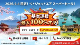 旅行【日本時間2026年4月5日1時まで】ベトジェット スーパーセールまとめ|日本-ベトナム全路線がコード入力で最大100%オフ
