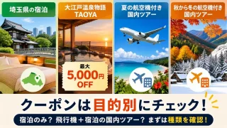 PR:本記事はプロモーションを含みます。JTBで、2026年4月27日から国内旅行向けのクーポンが複数有効になっています。今回押さえたいのは、埼玉県の宿泊、大江戸温泉物語・TAOYA、夏の航空機付き国内ツアー、秋から冬の航空機付き国内ツアー...
