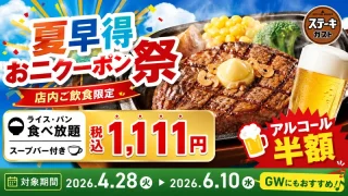 PR:本記事はプロモーションを含みます。ステーキガスト公式Xで、「夏早得おニクーポン祭」が案内されています。対象期間は2026年4月28日から2026年6月10日までです。店内ご飲食限定のクーポン企画で、ライス・パン食べ放題、スープバー付き...
