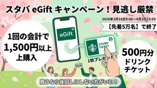 食【2026年3月】スターバックス eGift購入で500円分ドリンクチケットプレゼント攻略|1,500円以上・4月3日まで・先着5万名