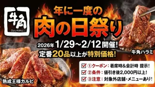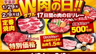食【2026年1月-2月】安楽亭「W肉の日!!リレーフェア」攻略|1/24-2/9はカルビ319円・ロース429円、大皿500円引きとランチ1.5倍の条件