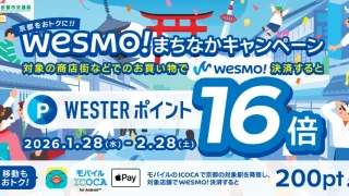 旅行【2026年1月-2月】京都をおトクに!! Wesmo!まちなかキャンペーン攻略|ポイント16倍8%と電車利用200ptの取り方