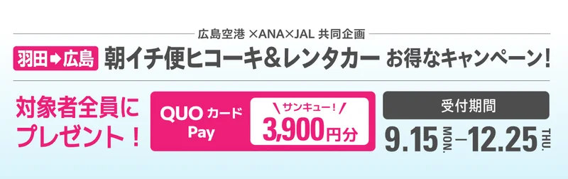 羽田→広島の朝イチ便で飛び、広島空港でレンタカーを借りるだけ。対象者全員にQUOカードPay3,900円がもらえるキャンペーンが公開されています。対象期間は2025年9月15日〜12月25日搭乗分。往路はNH671 または JL253のいずれかに搭乗することが必須で、復路を含む羽田⇄広島往復と広島空港での対象レンタカー利用が条件です。旅費を抑えつつ広島を効率よく回りたい人に相性が良い内容なので、要点だけ手早くチェックして活用のコツまでまとめます。