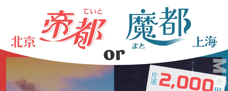 今回の訴求は「中国2大都市旅くらべ」。最低運賃は2,000円~で、設定は片道運賃。表示額に空港使用料・旅客税・決済手数料などは含まれない。席数・便は限定。販売開始前や終了後のステータスに切り替わるため、表示が「開始前/終了」の場合は日を改めて確認する。
