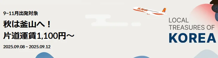 一般席は片道1,100円からの告知であり、税・空港使用料・燃油サーチャージは別途加算される。予約期間は短期で設定され、搭乗期間は秋シーズンを中心に構成される。対象は成田・関西・福岡・新千歳から釜山への直行便で、ビジネス系の運賃も割引対象が用意される。価格帯の訴求は大きいが、表示運賃と支払総額の差が生じやすいため、予約画面で必ず総額を確定させるべきである。