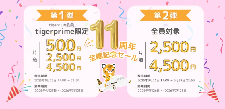 タイガーエア台湾が11周年を記念した特別セールを実施する。販売は二段構成で、9月25日は上位会員tigerprime限定、9月26〜28日は全会員・一般向けという流れだ。日本発着は片道500円・2,500円・4,500円の価格帯が提示され、燃油込み・諸税別途の想定である。搭乗対象はおおむね2025年9月下旬から2026年3月28日までの期間で、台北・台中・高雄行きの全路線が対象とされる見込みだ。販売席数は限定で、カートイン後のタイムアウトや決済混雑が起こりやすいため、事前準備が勝負を分けるセールである。
