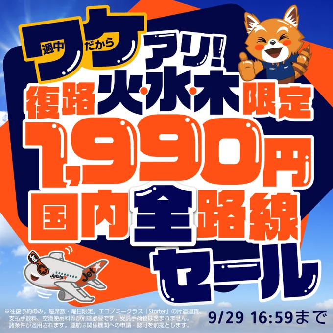販売期間は9月26日12:00〜9月29日16:59で、席数限定の完売次第終了である。表示運賃はエコノミー「Starter」の片道で、受託手荷物は含まれない。今回の特徴は「復路が火・水・木の対象便」である点と、往復予約のみ適用される点だ。対象便には便名指定のある路線も含まれるため、単純な日付選択だけでは価格が出ない場合がある。支払手数料や各種空港関連費用は別途必要であり、キャンセル不可・変更は手数料と差額負担で対応という一般的なLCC仕様である。