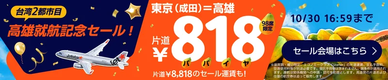 | 就航記念 目玉席 | 10/24 12:00〜10/30 16:59 | 12/18〜12/24 | 818円 | 成田→高雄、98席限定、Starter、諸税・手数料別 |