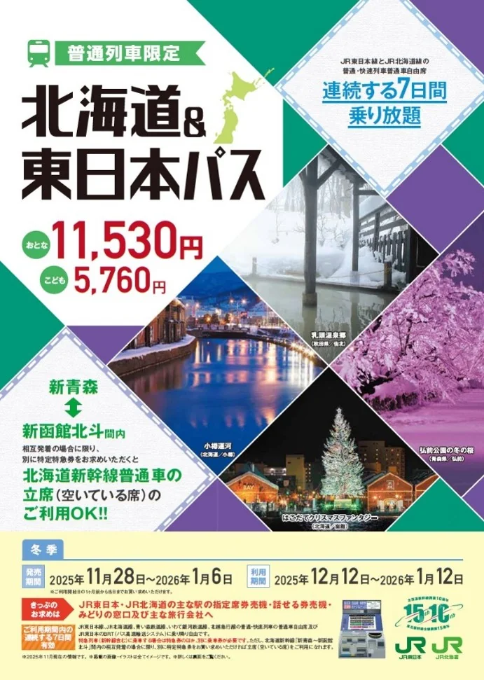 JR北海道とJR東日本が冬季シーズン向けに「北海道&東日本パス」を発売する。普通・快速列車の普通車自由席が連続7日間乗り放題で、青い森鉄道・いわて銀河鉄道・北越急行の普通列車やJR東日本のBRTも対象だ。発売は2025/11/28〜2026/01/06、利用は2025/12/12〜2026/01/12、有効は連続7日である。価格は大人11,530円・小児5,760円と据え置きの実用水準だ。