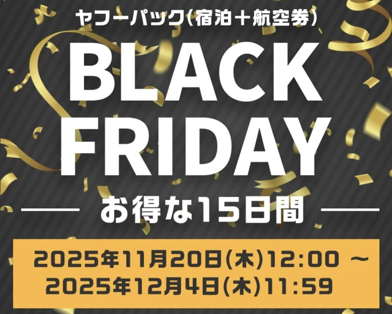 ヤフーパックブラックフライデーは、Yahoo!トラベルが提供する国内線航空券+宿泊のダイナミックパッケージ向けセールである。予約期間は2025年11月20日12時から12月4日11時59分までで、対象となる旅行の出発期間は11月21日から2026年5月10日出発分までとされている。対象プランには「ブラックフライデー」のラベルが付くため、一覧からセール対象だけを絞り込みやすい構成になっている。宿泊日程や利用航空会社によっては一部対象外の日程もあるため、詳細条件の確認は必須である。