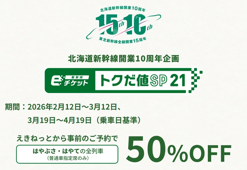トクだ値スペシャル21は、北海道新幹線の普通車指定席が50%割引になる強い商品だが、発売が乗車日21日前23:50までで、列車・席数・区間も限定されるため、予定が揺れる人には不向きである。2026年の設定期間は2月12日〜3月12日と3月19日〜4月19日で、代表例として新函館北斗⇔新青森は3,920円となる。変更は出発時刻4分前までの条件付きで、割引率は引き継がれない。予定固定度が高い場合のみ採用し、旅程が不確定なら通常の新幹線eチケット等へ逃がすのが合理的である。