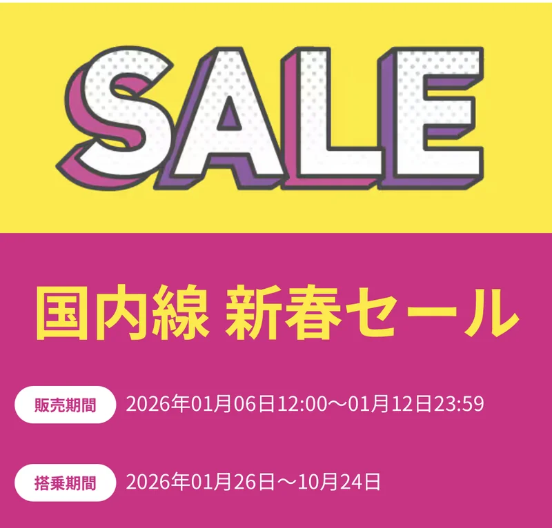 Peachの「国内線 新春セール」は、販売期間が2026/1/6 12:00〜1/12 23:59で、片道2,990円〜の例が出ている国内線セールです。搭乗期間は2026/1/26〜10/24が目安で、路線ごとに対象曜日や除外日が細かく設定されています。安さだけで突っ込むと手数料や荷物料金で想定外になりやすいので、予約前の確認ポイントをまとめます。