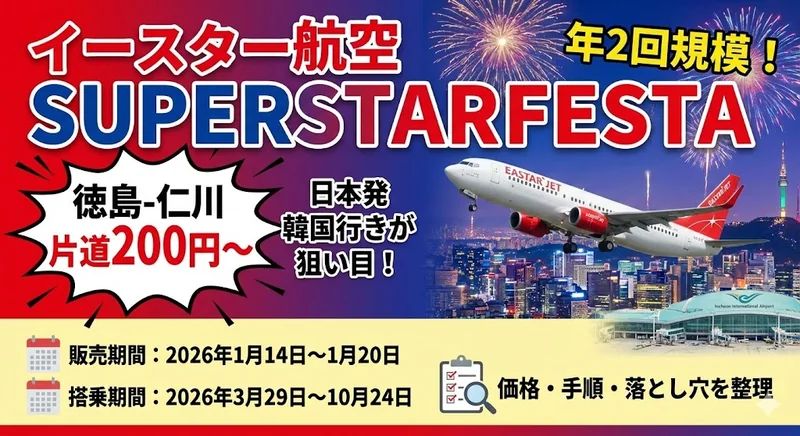 イースター航空が年2回規模のセール「SUPERSTARFESTA」を実施します。販売は2026年1月14日(水)午前10時から1月20日(火)まで(終了時刻は公式表示で要確認)、搭乗期間は2026年3月29日から10月24日まで。徳島-仁川が片道運賃基準で200円からなど、日本発の韓国行きが狙い目です。価格の見方と予約の手順、落とし穴だけを短く整理します。