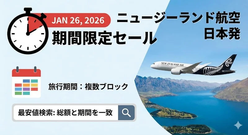 本記事は、ニュージーランド航空の日本発「ニュージーランド期間限定セール」を、購入判断に必要な数字だけに絞って整理する。ポイントは、販売期限が2026年1月26日で固定されている点と、旅行期間が複数ブロックに分かれている点である。最安帯を取りに行く場合は、まず「総額表示の往復運賃」と「対象の出発期間」を一致させ、検索で在庫が出る日を短時間で突き止める運用が有効だ。
