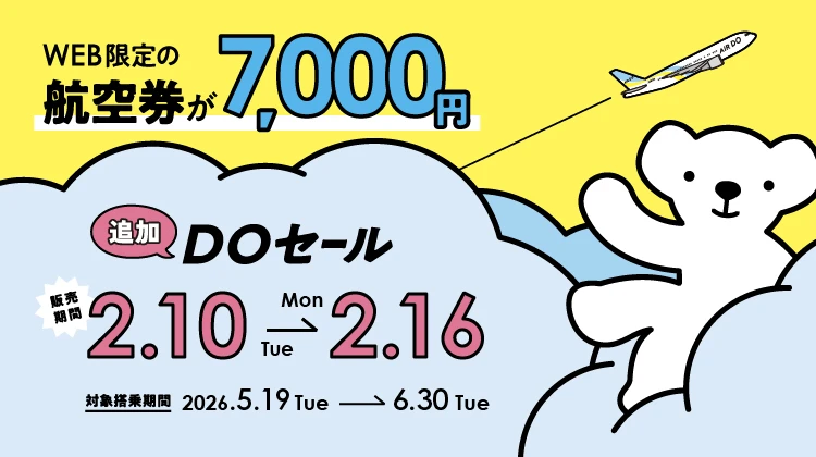 結論はシンプルで、DOセールは全路線が片道7,000円、対象搭乗は2026年5月19日〜6月30日、販売は2026年2月10日0:00〜2月16日23:59です。席数は便ごとに限りがあり、便によっては設定がない場合もあります。予約完了日と同日に購入が必要で、決済まで終わって初めて確定します。また、2026年3月29日〜5月18日搭乗分のセールは2026年2月9日23:59まで別枠で実施中なので、搭乗期間を取り違えないでください。