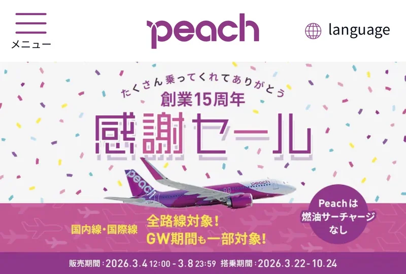 【2026年3月】Peach 感謝セール攻略|全路線対象、国内2,990円〜・国際4,190円〜