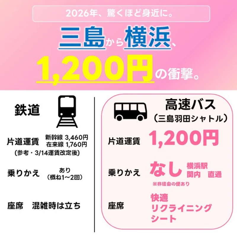 三島羽田シャトルは、2026年2月1日出発分から横浜1,200円、羽田エアポートガーデンと国際展示場駅2,600円、東京ディズニーランド3,000円という形で見れば整理しやすい路線です。荷物を持った移動、復路の空港利用、三島大場の駐車場活用まで考えると、数字以上に使い勝手が良いです。逆に、支払い期限と時刻表確認を雑にすると普通に失敗します。使うなら、便時刻と支払い完了までを同じタイミングで片付けるべきです。
